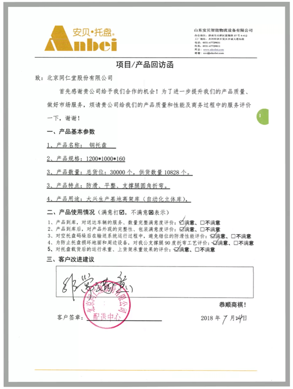 安貝為北京同仁堂藥業(yè)立體庫(kù)項(xiàng)目的30000個(gè)貨位配套了鋼托盤(pán)產(chǎn)品,得到了北京同仁堂領(lǐng)導(dǎo)的高度評(píng)價(jià)