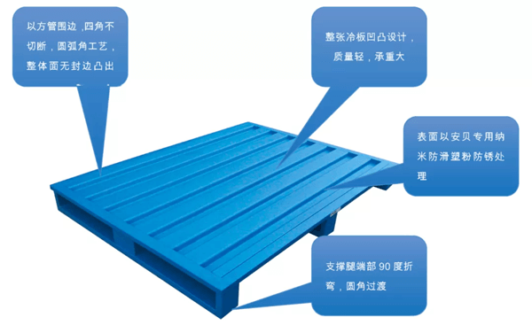通過(guò)鋼板幾何變形設(shè)計(jì),有效的增加承重,同時(shí)節(jié)約用料,讓鋼托盤(pán)輕而承重,更方便搬運(yùn)。