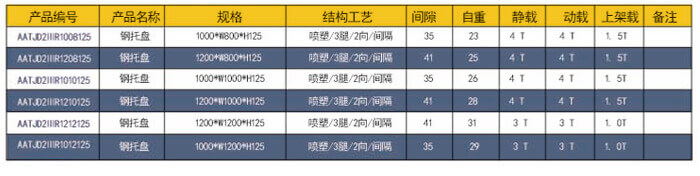 四向三腿——方管鋼托盤 技術參數說明: 產品編號: AACJD4ⅢC1212150 產品名稱:方管鋪面川字鋼托盤 產品規(guī)格: 1200*1200*150 產品自重: 29kg 防銹工藝: 靜電沙紋噴塑 產品靜載: 2000KG(均勻載重) 產品動載: 1.500KG(均勻載重) 產品上架: 1200KG(均勻載重) 主要用途: 倉庫、車間周轉、物流倉儲