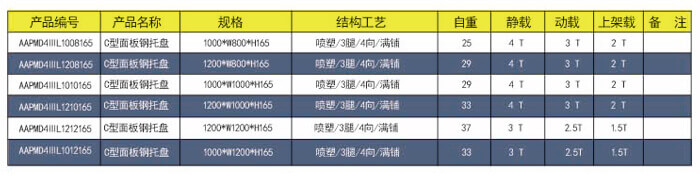 四向三腿——C型面板鋼托盤 技術(shù)參數(shù)說明: 產(chǎn)品編號(hào): AAPMD4ⅢL1210165 產(chǎn)品規(guī)格: 1200*1000*165 產(chǎn)品自重: 33kg 防銹工藝: 靜電沙紋噴塑 產(chǎn)品靜載: 3000KG(均勻載重) 產(chǎn)品動(dòng)載: 2500KG(均勻載重) 產(chǎn)品上架: 1500KG(均勻載重) 主要用途: 倉庫、車間周轉(zhuǎn)、物流倉儲(chǔ)