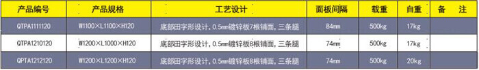 產(chǎn)品編號:QTPA1111120 產(chǎn)品規(guī)格:W1100×L1100×H120 托盤主孔:100mm 托盤側(cè)孔:80 mm 產(chǎn)品自重:16 kg 產(chǎn)品靜載:800kg 產(chǎn)品動載:600kg 上貨架載:不建議 產(chǎn)品配置:采用寶鋼鍍鋅板軋機(jī)成0.5*10*85 多筋骨面板10根,以間隔84mm 和6根板做腿+9個(gè)立撐組成。 產(chǎn)品用途:廣泛用于酒水、食品、化工、電子 等大量物品倉儲與周轉(zhuǎn)。 產(chǎn)品缺陷:不宜上貨架。